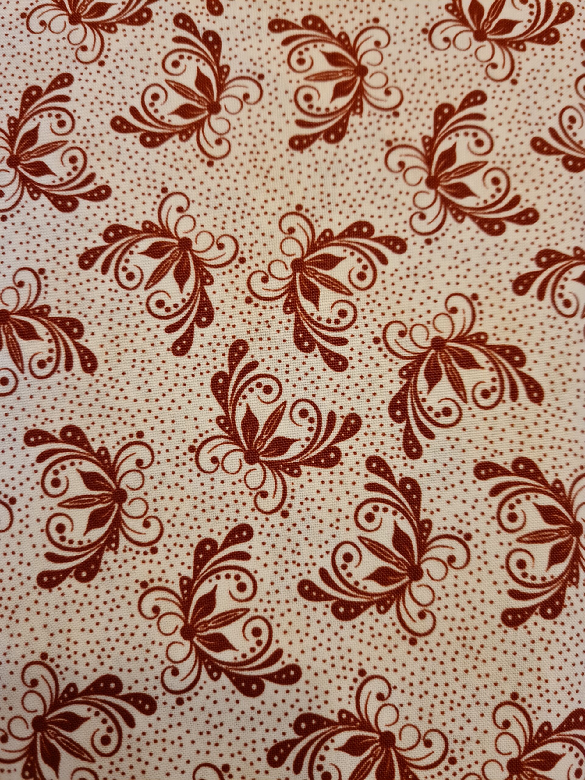 Patchworkstof med råhvid bund med små røde prikker. Blomster af mørk rød farve.