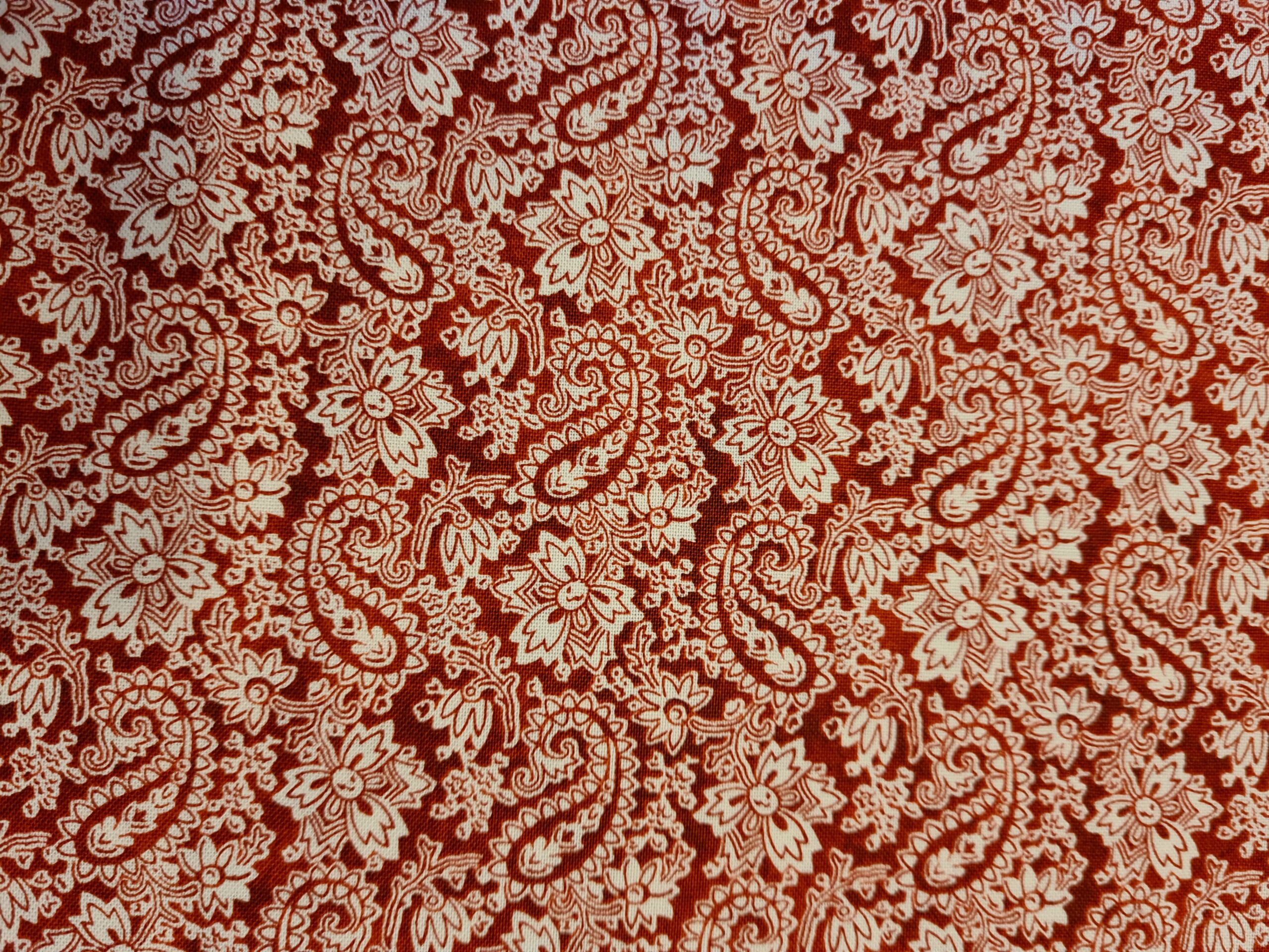 Mørk rød patchworkstof med hvide blomster og snirkler.