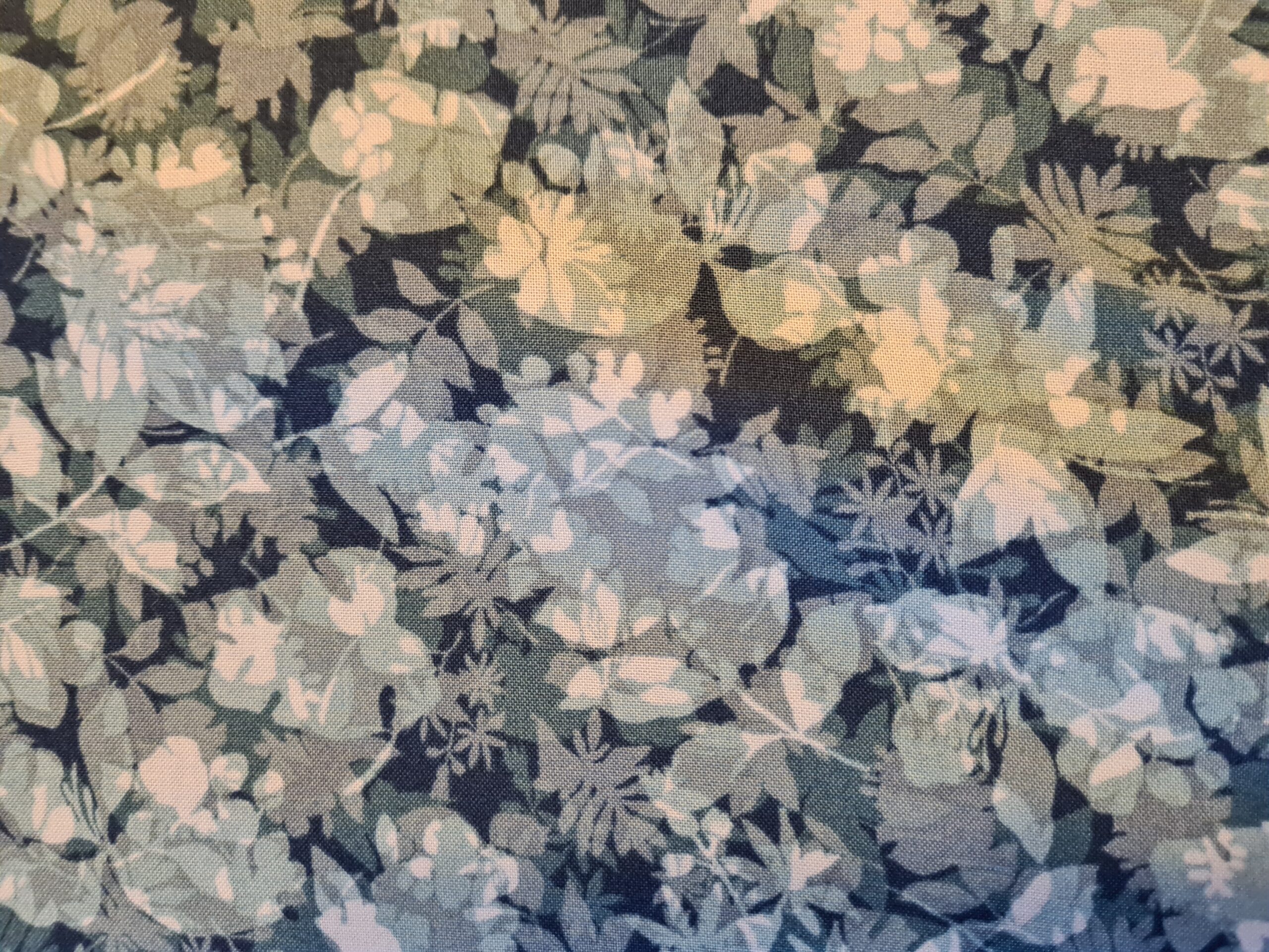 Lys blå patchworkstof med blomster.