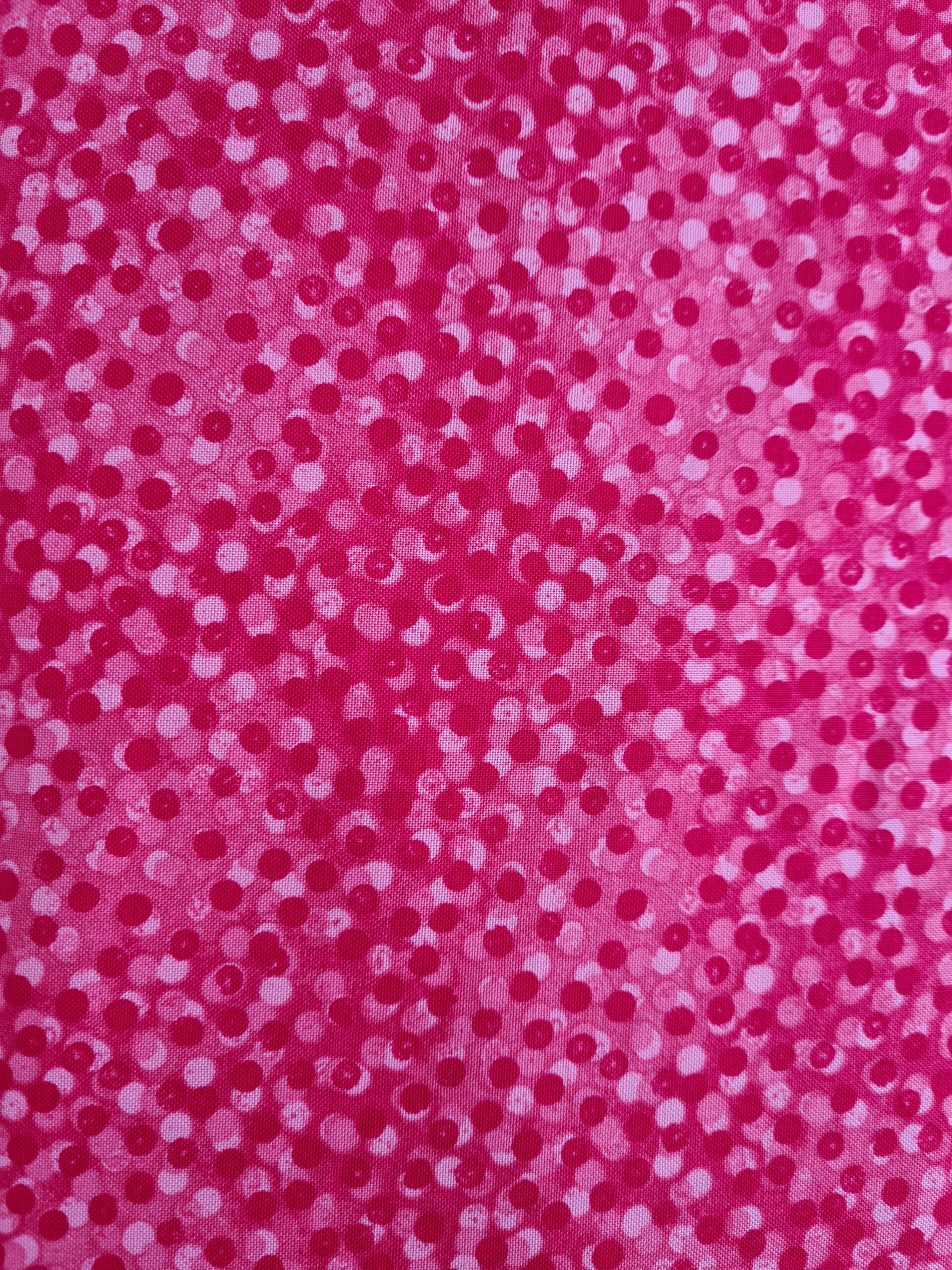 Rød patchworkstof med lyse og lyserød bomber.